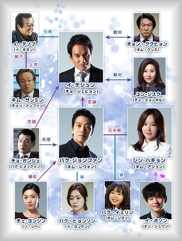 ★命の期限を知ったジョンファンが今までの人生を振り返り、元妻と娘のために、忠誠を尽くしてきたテジュンに背を向けるというストーリーだそうです。権力者たちの野心と欲望に翻弄されながらも正義を貫く元夫婦の深い愛と絆を描いた感動作。同時間帯ドラマの中で視聴率1位を獲得したドラマであり、最終回が最高視聴率だったことを見ても、ドラマの内容が視聴者の心を鷲づかみにするものであったことは想像できますよね。病気モノはちょいと苦手なんですが、このドラマは「死」をテーマにしているわけではなさそうなので興味津々。ぜひ見てみようと思ってます。
