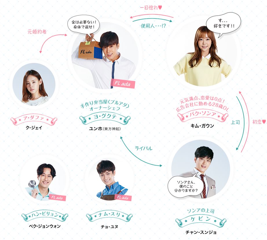 ある日、弟に頼まれて、ヨ・グクテ(ユンホ(東方神起))がオーナーシェフを務める手作り弁当屋「プルアダ」に弁当を取りに行き、グクテに一目惚れする。