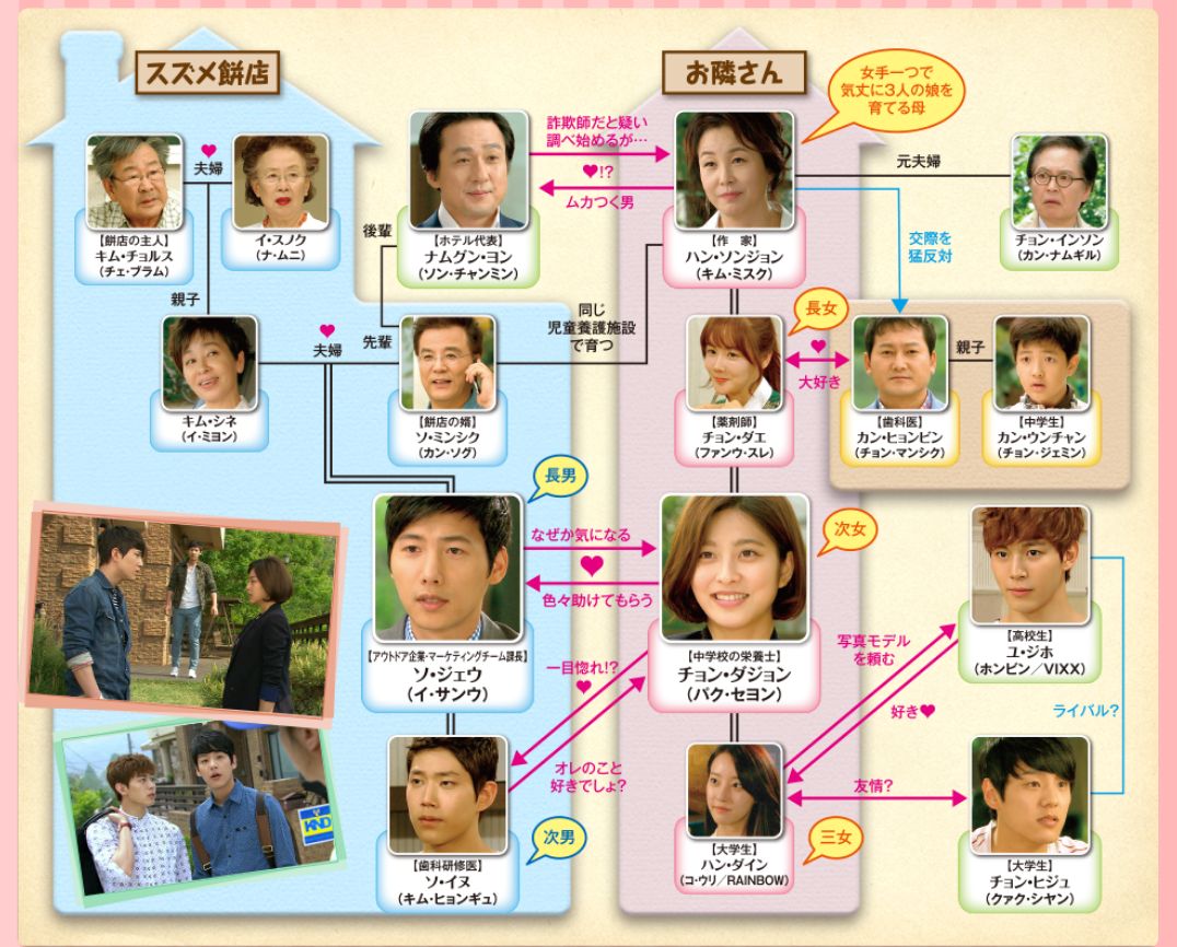 家賃が払えなくなったソンジョンは、偶然再会した幼なじみのソ・ミンシク(カン・ソグ)の家に家族みんなで間借りすることになるんですね。このミンシクというのがジェウとイヌのお父さんなわけ。そんなわけで突然お隣さん同士として再会したダジョンとジェウたち。若者たちの恋愛、夫婦愛、大人の恋愛など様々な形の愛をコミカルに、そして爽やかに描き、見る人すべてに心地よい笑いと感動をもたらす作品です。